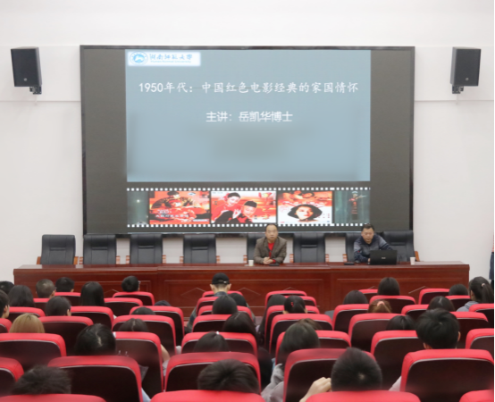 9月29日下午,湖南师范大学文学院副院长、博士生导师岳凯华教授应邀做客“湖艺大讲堂”,他以《1950年代:中国红色电影经典的家国情怀》为题,在博艺楼917报告厅为学院师生作精彩讲座。讲座由科研处长张建安教授主持。