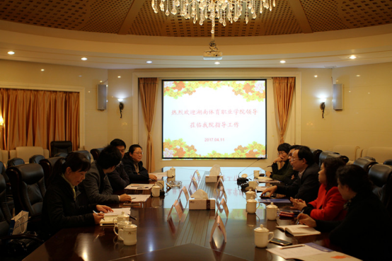 4月11日,湖南体育职业学院院长、党委副书记谭焱良,党委副书记、副院长陈新良率领该院人事处相关负责人来学院进行考察交流。学院在剧场会议室举行座谈会,院党委书记鲁雁飞,副院长杨向东,党政办、组织人事处处、财务处等部门负责人接待考察团并参加了座谈。座谈会由杨向东同志主持。