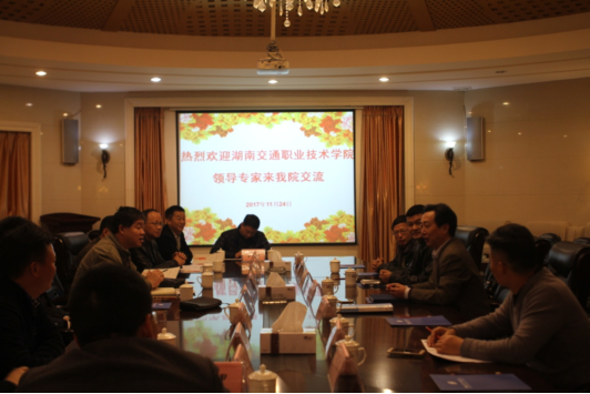 11月24日下午,湖南交通职业技术学院副院长、工会主席樊正斌及相关部门、二级学院负责人一行10人来我院进行交流学习。学院在实验剧院会议室举行了座谈会,院党委书记王章华,副院长周文清、刘家海热情接待了来访客人,党政办、学工处、保卫处负责人参加了座谈会。会议由周文清主持。